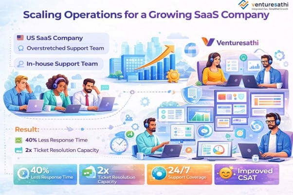 Venturesathi implemented a structured remote work outsourcing model by integrating an external support team into existing workflows. Clear SOPs, shared dashboards, and performance metrics were established to ensure alignment with internal teams.